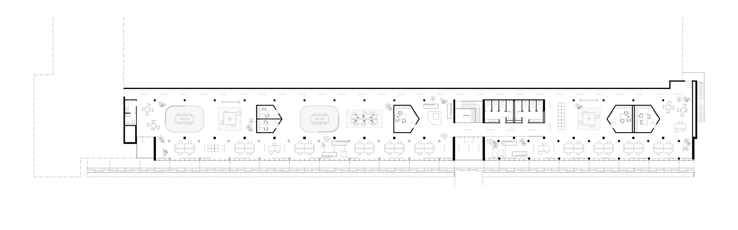 We wanted to find a new way of using broad workplaces, somewhere between the absolute open space layout typically adopted by some American corporations and the more classical box-adjoining strategy. We came up with the idea of not defining the areas occupied by the distinct departments: we proposed instead to use the 98-meter-long building as a gradient from the quietest to the most rumorous tasks on the x-axis and from the slowest to the fastest activities on the y-axis, providing spaces for connection, isolation, and execution. The result is a flexible workspace that offers various layouts, emphasizing employees' ability to choose their work style.